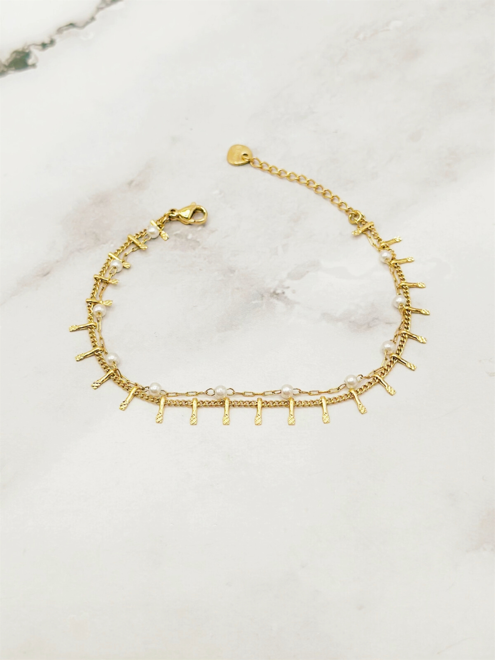 Perlerne symboliserer renhed og femininitet, mens de små gyldne detaljer tilføjer et eksklusivt touch. Den justerbare kædeforlængelse med hjertedetalje giver armbåndet ekstra charme og sikrer, at det passer perfekt om håndleddet.