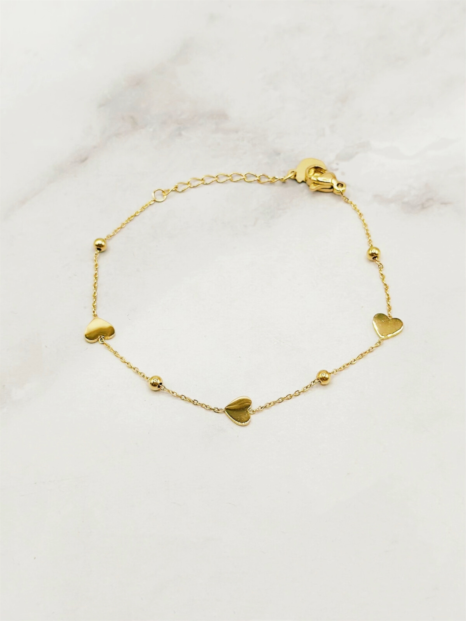 Armbåndet består af en tynd, delikat kæde i forgyldt rustfrit stål, dekoreret med små hjerter og glatte kugledetaljer, som giver et elegant spil i designet. Hvert hjerte symboliserer kærlighed, varme og glæde – og gør dette armbånd til en perfekt gaveidé til en, du holder af, eller som en smuk selvforkælelse.