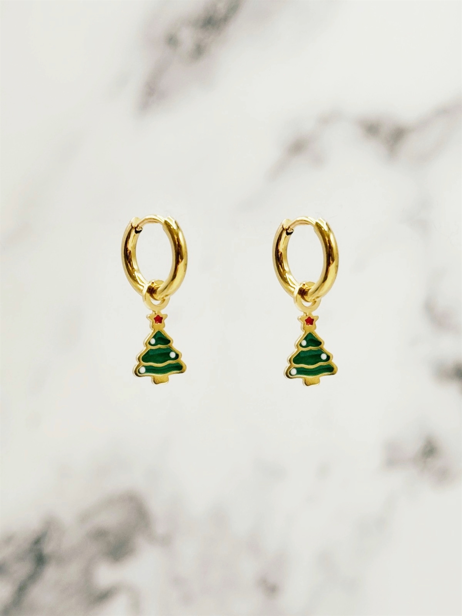 Øreringene er designet i forgyldt rustfrit stål og dekoreret med små emaljerede juletræer i klassiske grønne, røde og hvide farver. Hvert træ har en lille rød stjerne i toppen og fine detaljer, der fanger lyset smukt. Resultatet er et sæt øreringe, der kombinerer humor, hygge og elegance i ét og samme design – ideelle til juletiden.