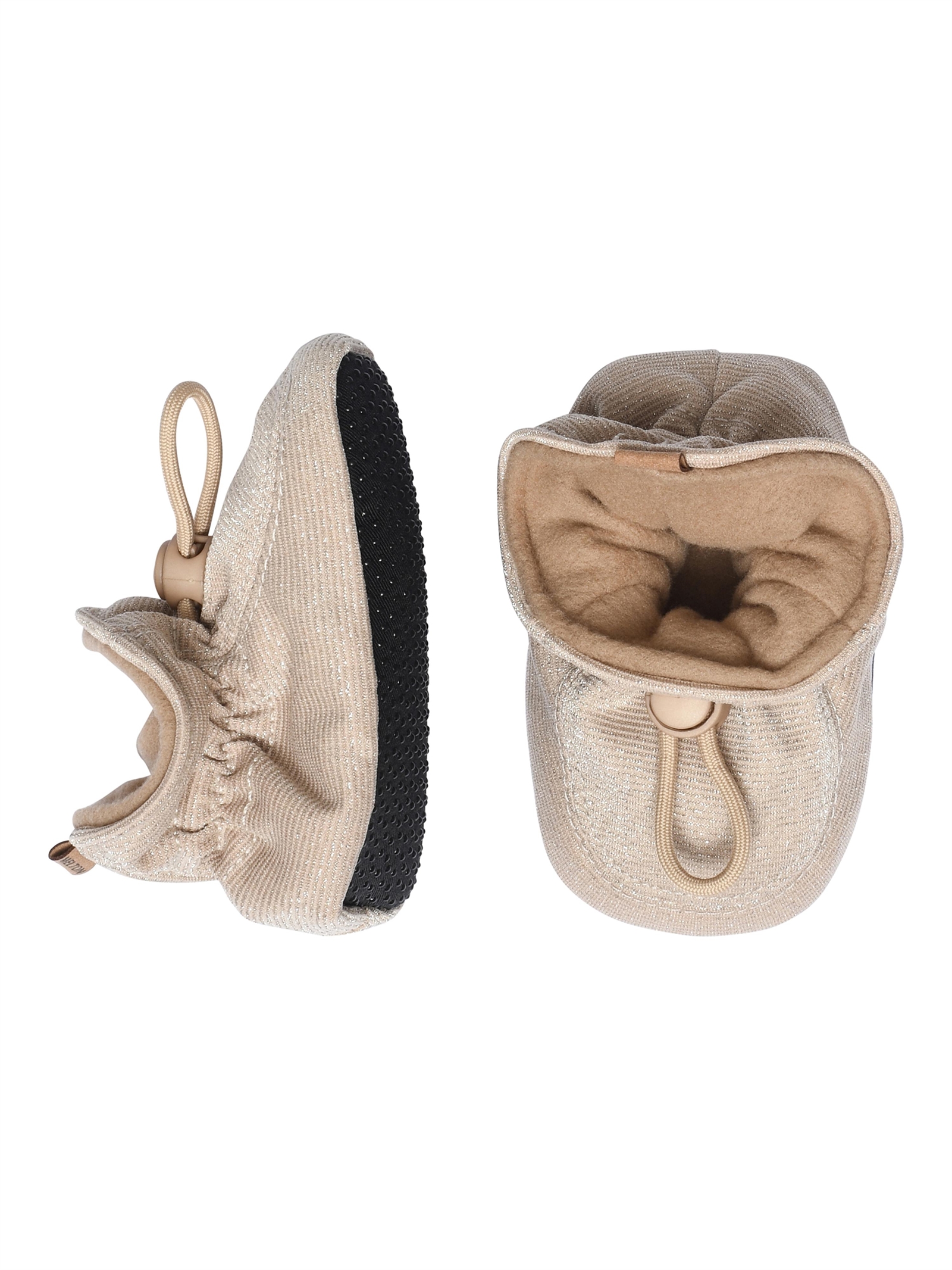 Ydersiden er fremstillet i et blødt og strækbart materiale med et elegant guldskær, der giver futterne et eksklusivt og festligt udtryk 💛 Indvendigt er de foret med blød fleece, som føles utrolig behagelig mod huden og sørger for, at fødderne holdes varme på selv de koldeste dage.