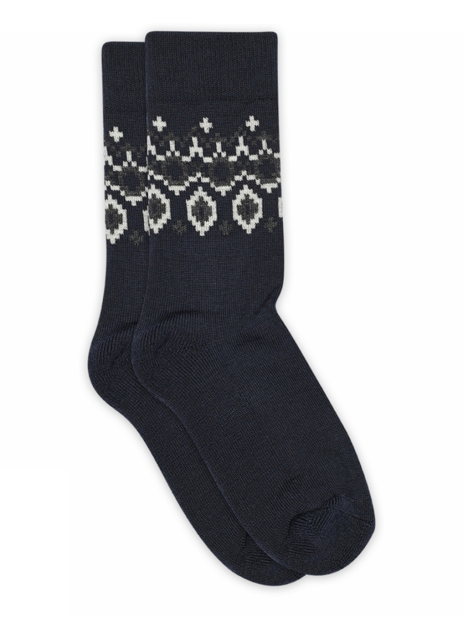 Designet prydes af et smukt jacquardmønster i kontrastfarver omkring skaftet, inspireret af klassisk nordisk strikkekunst. Den dybe Navy-farve tilfører et stilrent, tidløst udtryk, som passer perfekt til både hverdags- og vintergarderoben.