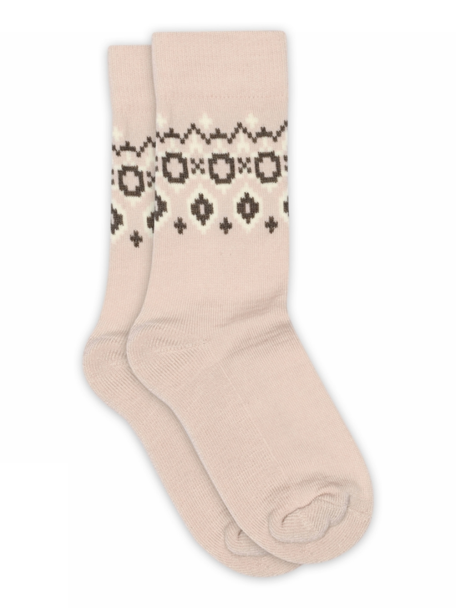 Omkring skaftet finder du et smukt jacquardstrikket mønster i kontrastfarver, inspireret af klassisk nordisk strikketradition. Den fine Rose Dust-farve giver et feminint og blødt udtryk, der både kan bruges til hverdag og særlige lejligheder. Den matcher smukt med neutrale farver, vinterens mørke nuancer og forårets lysere toner.