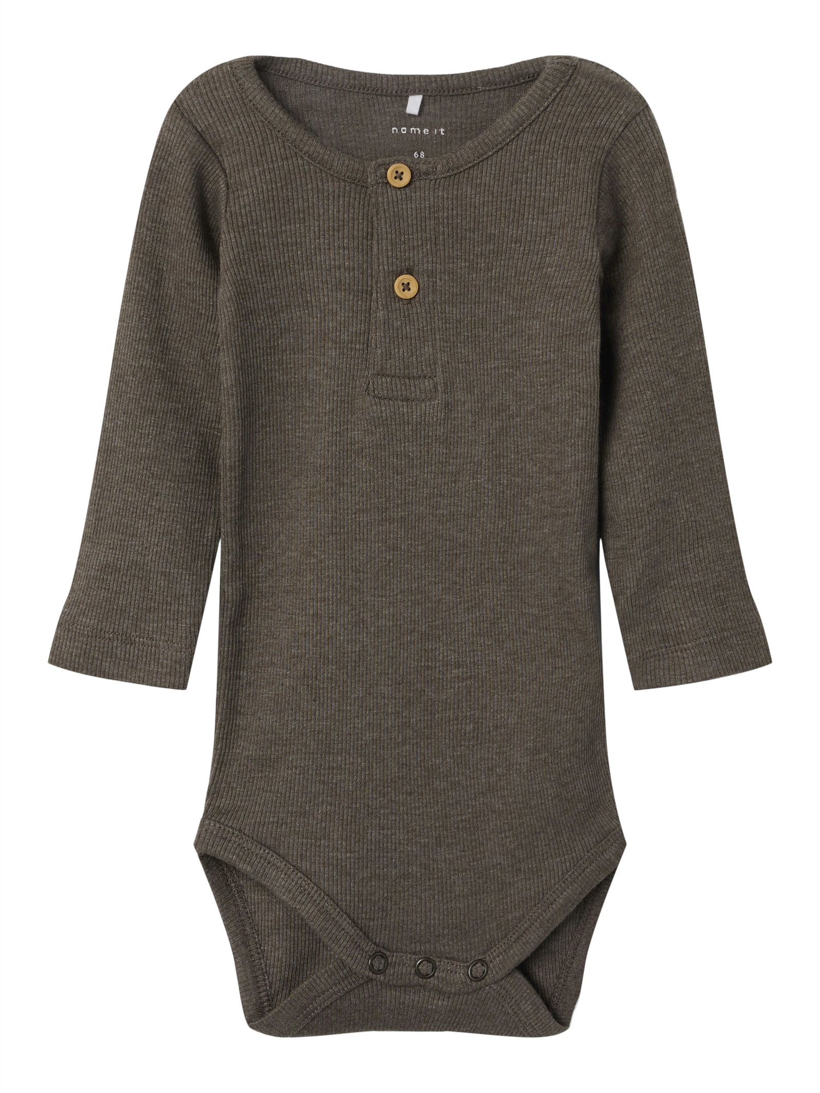 Designet er klassisk og stilrent med lange ærmer og en henley-lukning foran, pyntet med to fine træknapper, der giver et naturligt og nordisk udtryk 🍂 De praktiske trykknapper mellem benene gør det nemt at klæde babyen af og på, samtidig med at bodyen sidder godt – også efter mange vaske.