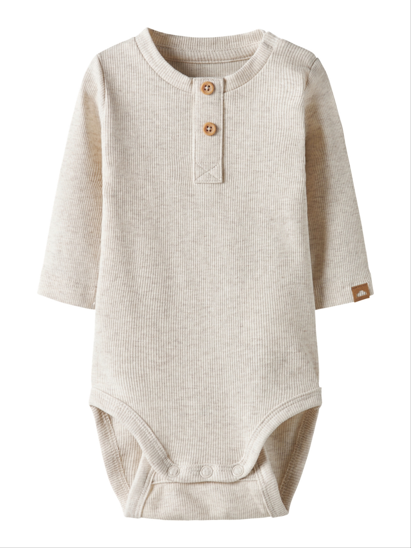 På fronten findes en fin henley-lukning med to dekorative knapper i trælook, som giver designet et ekstra touch af naturlig charme. Knapperne er samtidig praktiske, da de gør det nemmere at få bodystockingen over barnets hoved, uden at det bliver ubehageligt. I bunden sidder tre trykknapper, der gør bleskift hurtigt og nemt – perfekt til travle morgener og små uheld i løbet af dagen 😊🍼.
