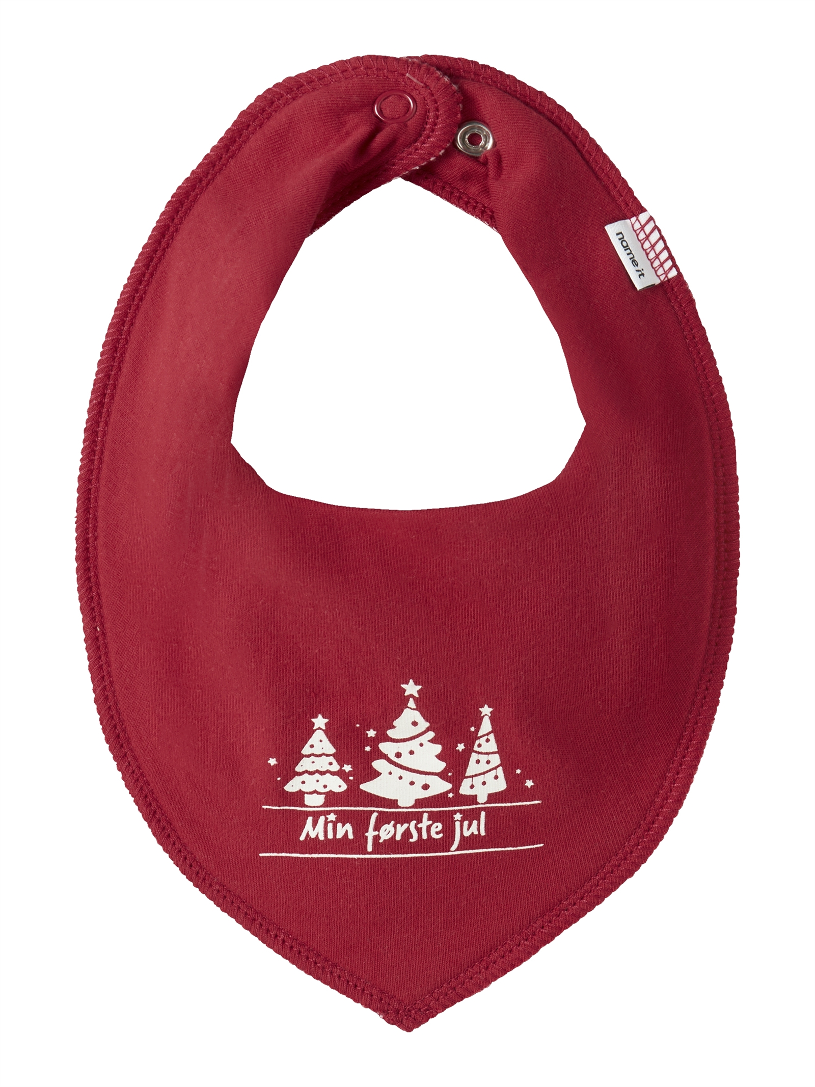 Rød jule-savlesmæk fra Name It med teksten “Min første jul” set forfra