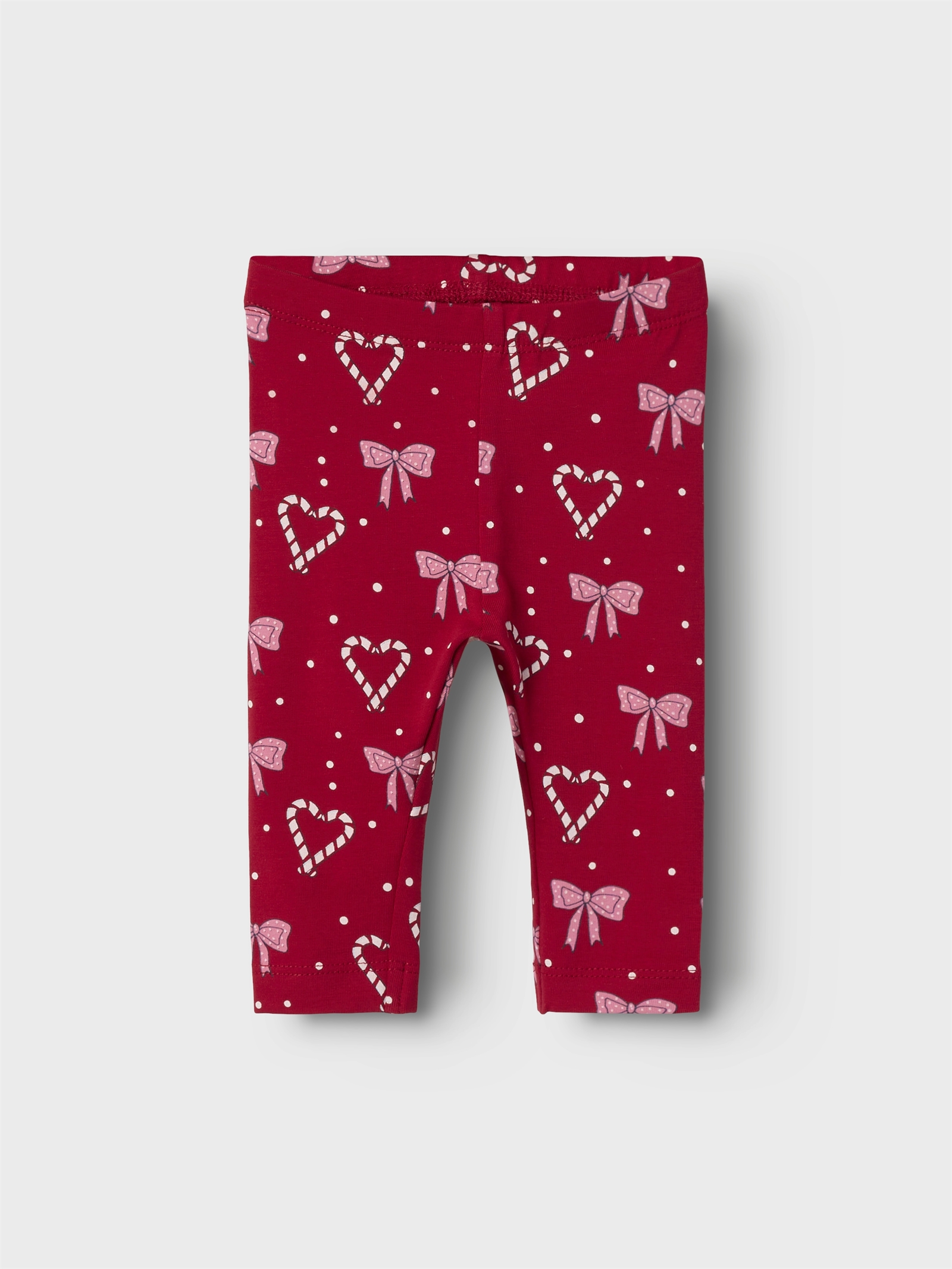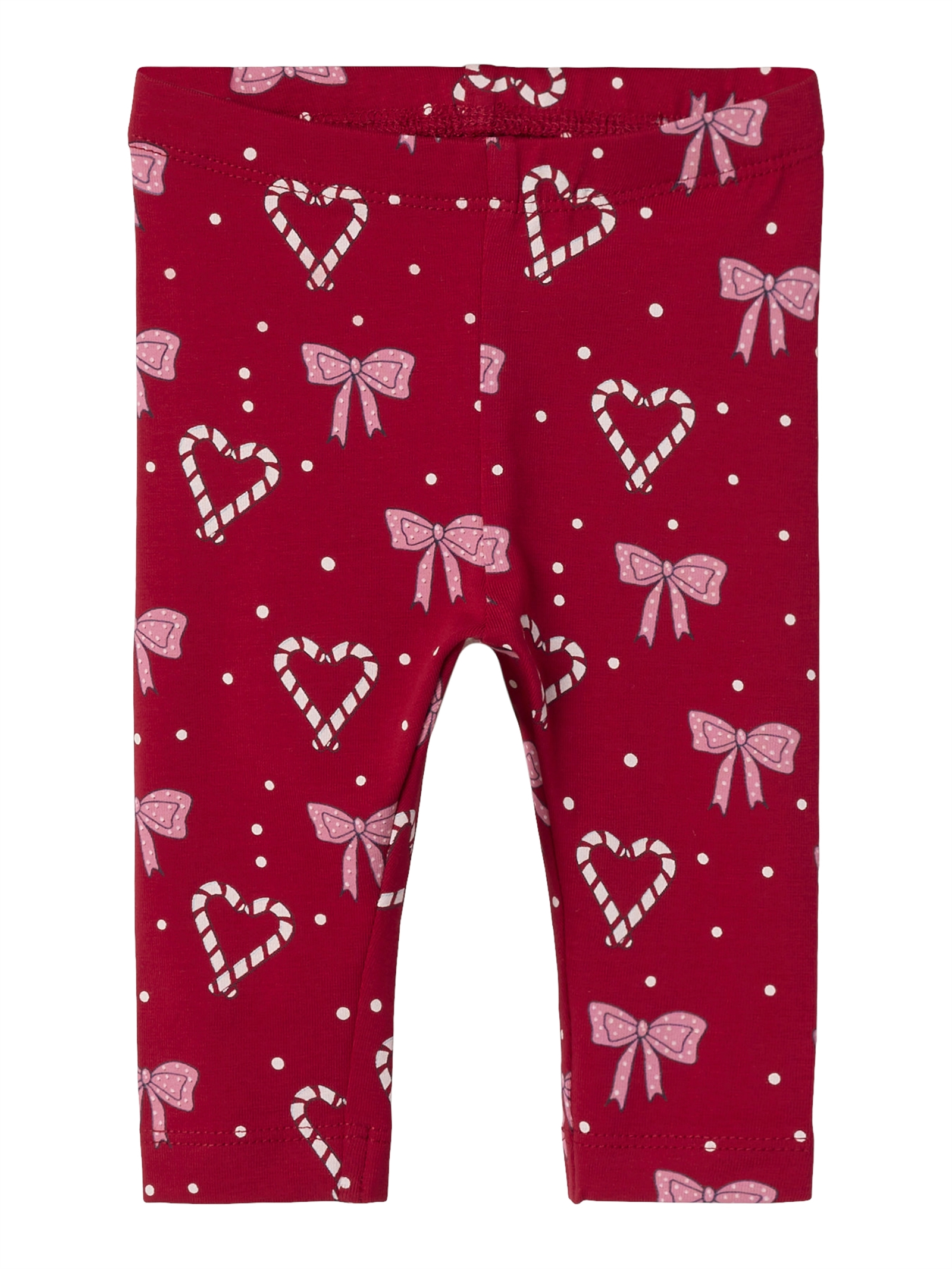 Røde Name It juleleggings med sløjfer, hjerter og prikker set forfra