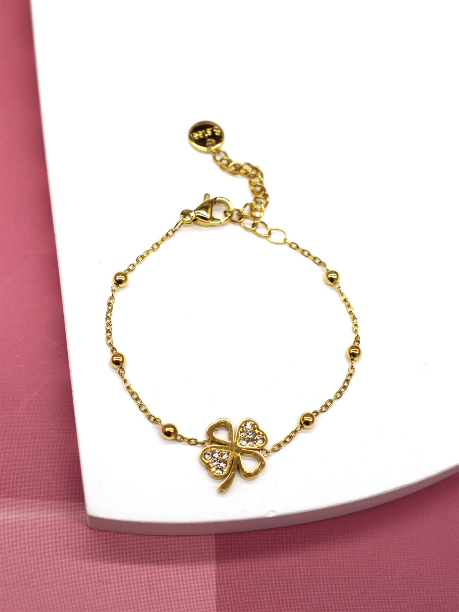 Rouge Bonbon armbånd i guld med firkløver vedhæng og sten set forfra