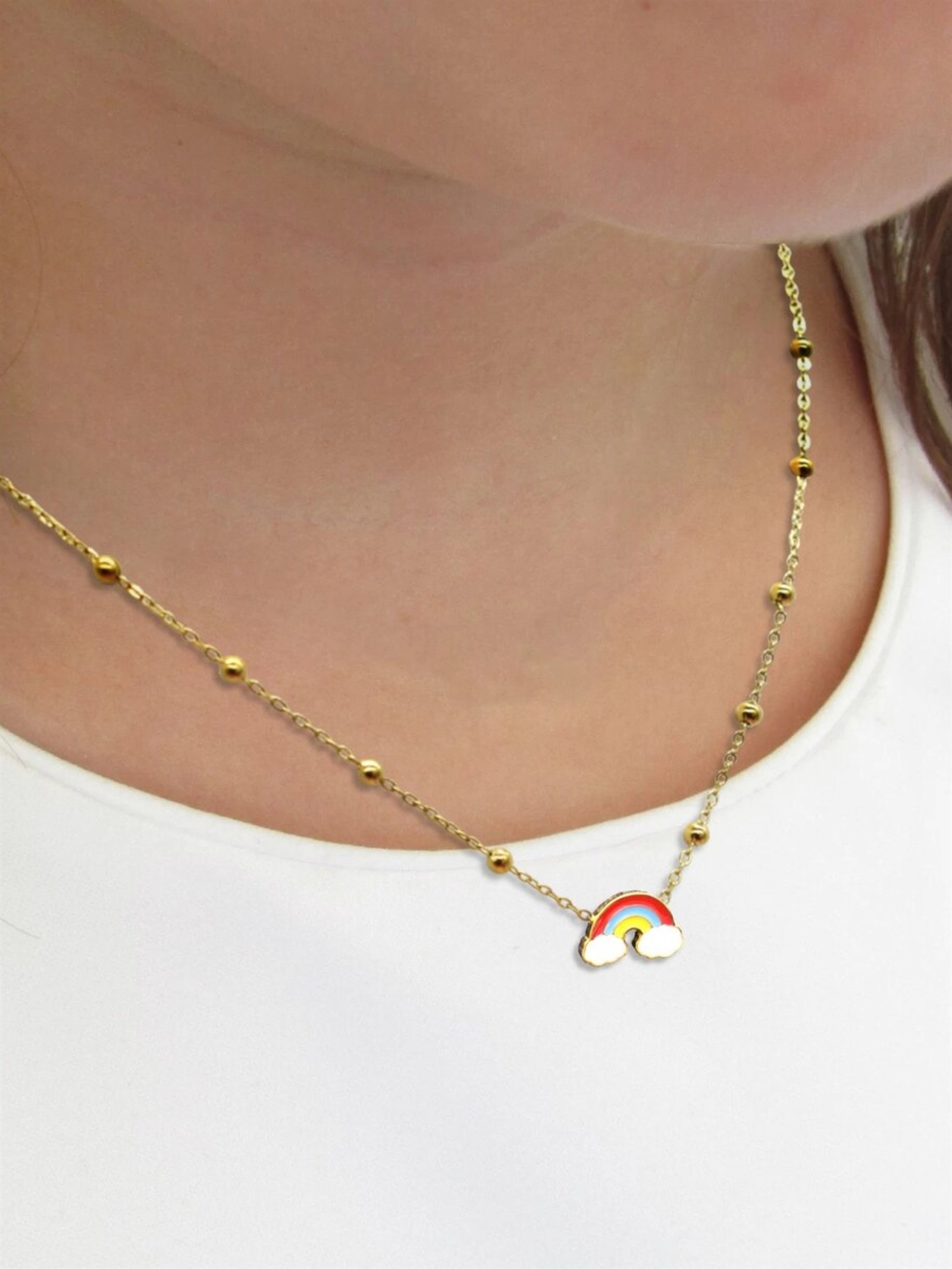Rouge Bonbon børnehalskæde i guld med regnbuevedhæng set forfra