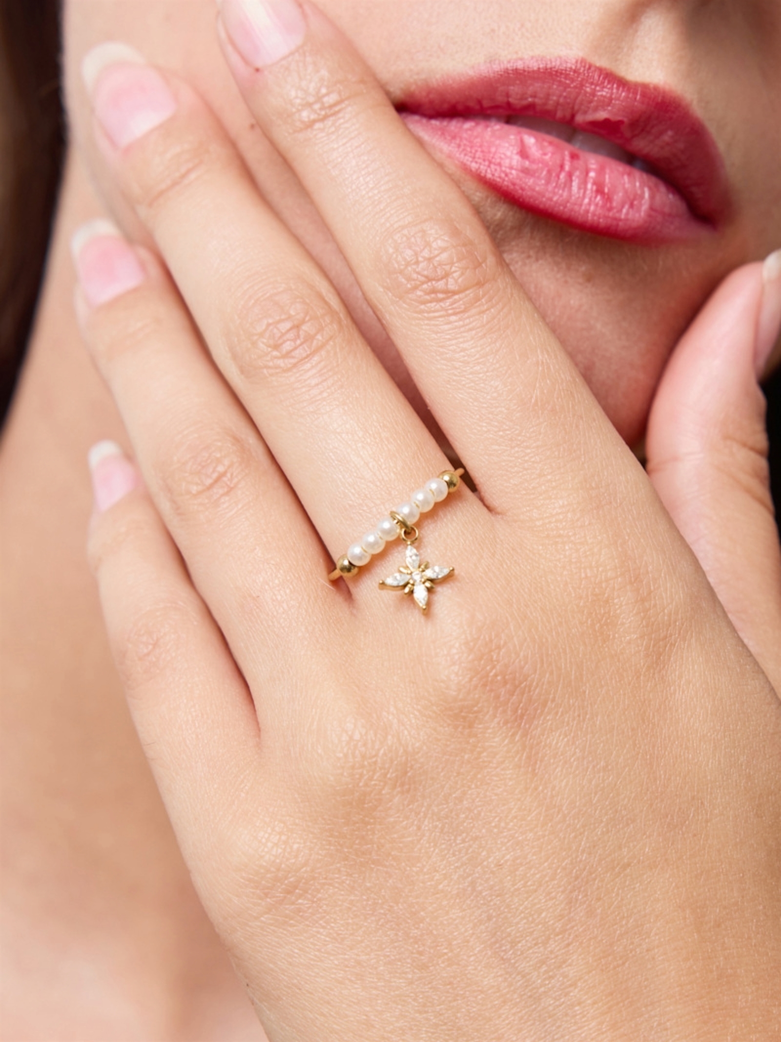 👉 Kort fortalt: En elegant guldfarvet ring med perler og funklende blomst charm – justerbar, stilfuld og perfekt til både hverdagsbrug og særlige anledninger 🌟.