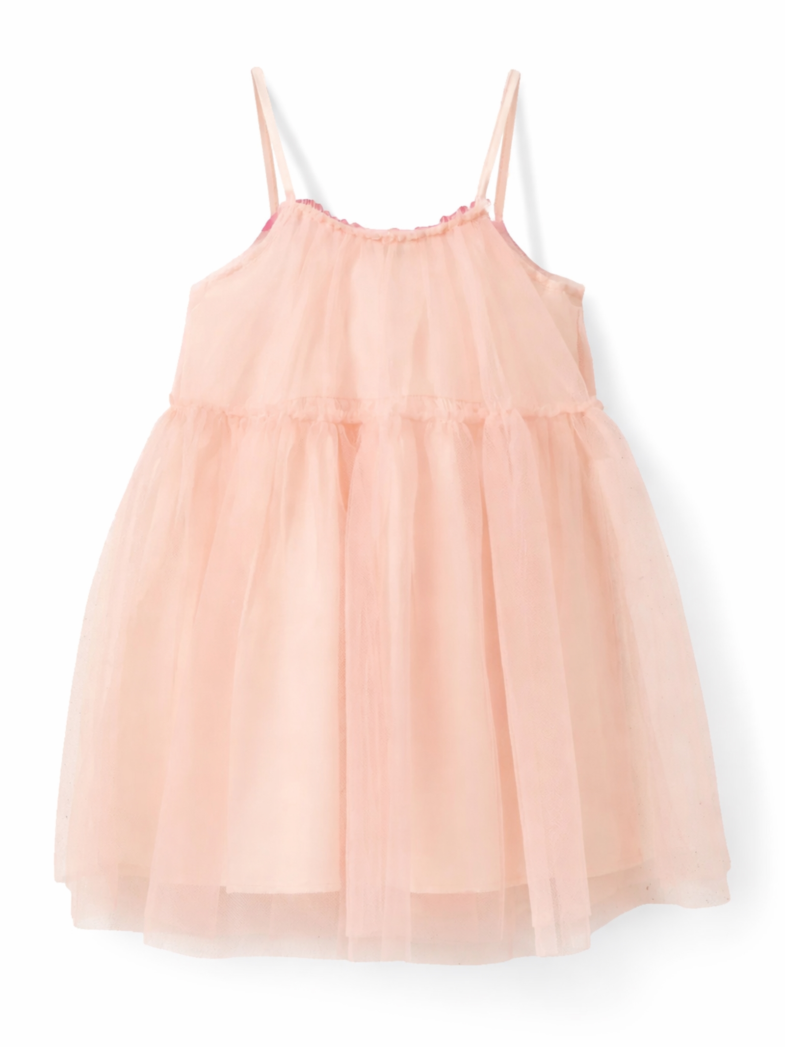 Denne smukke tyl kjole i Douce Pink er den perfekte kjole til piger, der elsker et romantisk og eventyrligt look. Kjolen kombinerer et let og luftigt design med fine detaljer, som giver et elegant udtryk – perfekt til både festlige begivenheder og hyggelige hverdage, hvor der gerne må være lidt ekstra prinsessestemning.